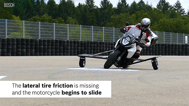 这套系统由德国供应商大厂博世研发,在摩托车的底部两侧,安置了两套方向不同的压缩气体装置,当摩托车后轮碾压到砂石,或者突然行驶到了附着力极低的路面上时,压缩气体会在瞬间释放出来,用一只无形的手把摩托车按压回正确的轨道上。