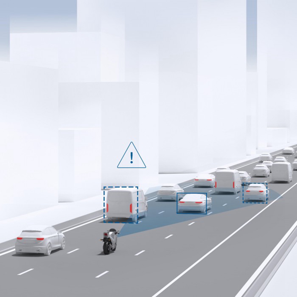 同样是博世,给摩托车提供了一套自适应巡航的解决方案,在开启后摩托车会对前方路况进行持续观察,当摩托车面临碰撞危险的时候,会通过灯光和声音等多种方式及时提醒驾驶员。