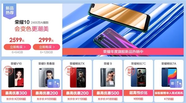 原标题:荣耀V10 4GB+64GB直降300元:极光蓝售价2399元