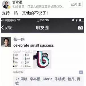 在张一鸣和马化腾朋友圈“掐架”不久,原阿里巴巴大文娱集团董事长俞永福在社交媒体转发并评论称,“支持一鸣,其他的不说了。”