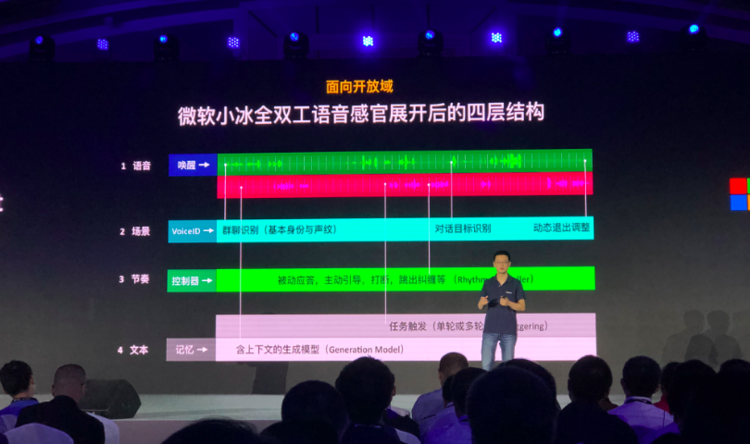 小冰全双工语音感官展开之后,其实是四个结构。第一层是语音唤醒,实现最基本的语音读取进入话题;第二层考虑的是场景,对对话目标进行识别以及抛出什么样的问题;除此之外,小冰还要学会控制聊天节奏,提取上下文的记忆,比如是选择来了问题被动应答,还是提出新问题做引导,甚至还可以直接打断对话,跳出去纠缠等。