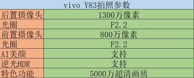 在开始测试之前,我们先来了解一下Y83的拍照硬件参数。在后置镜头上,vivoY83采用了一颗1300万像素F2.2的光圈,支持逆光HDR模式。在前置上,则采用了800万像素,配以F2.2光圈,AI美颜测加入,相信能够让Y83的拍照成像更进一步。5000万像素超清画质的加持,使得Y83有着超越同级别的优势。下面我们就来看看它的具体表现吧。