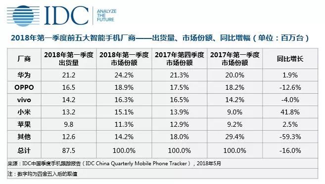 同时根据 IDC 对中国市场的统计,2018 年第一季度,除了华为、OPPO、vivo、小米和苹果五家手机厂商外,其他品牌整体出货量更是大跌 59.3 %。