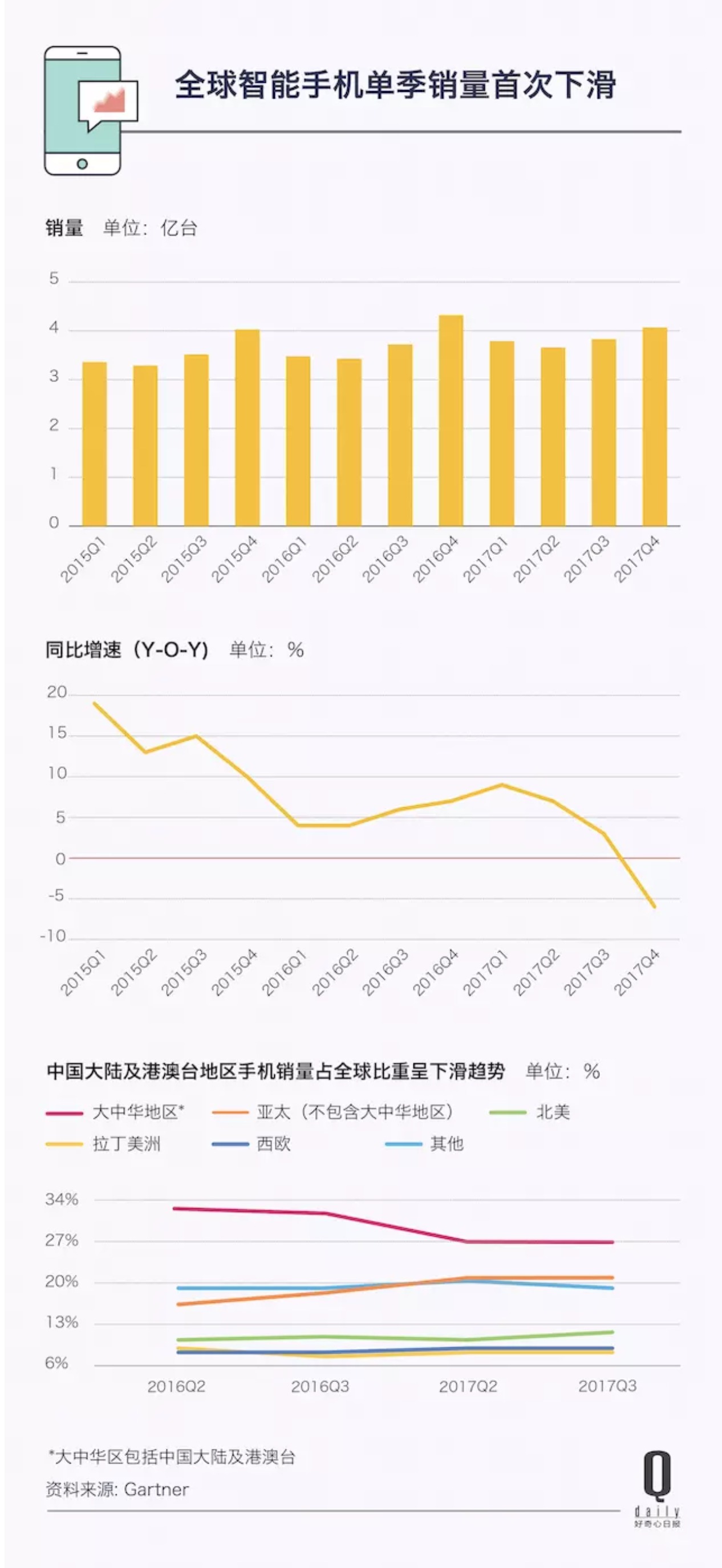 根据国外权威调研机构 IDC 的数据,2017 年全球智能手机出货量共计 14.62 亿台,同比下滑了 0.5%,智能手机有史以来第一次出现下跌。