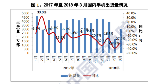 这个跌势还在持续,根据中国信息通信研究院发布的《2018 年 3 月国内手机市场运行分析报告》,2018 年 1-3 月,中国智能手机出货量为 8187.0 万部,同比跌幅达到 26.1%。