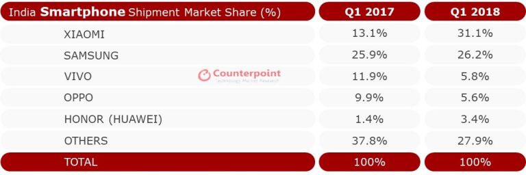 其中中国厂商的身影尤为活跃,截止 2018 年第一季度,小米、Oppo、联想、金立和 vivo 占据了印度智能手机市场 50% 的份额。