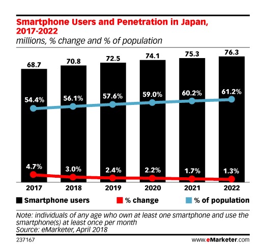 日本智能手机普及慢,老龄化是重要原因同样是发达国家的日本,智能手机的普及率却低得惊人,只有 54.4 %,分析机构 eMarketer 预测今年日本的智能用户有望达到 7080 万人,占总人口的 56.1%,还够不上全球的的平均值 (63 %)。