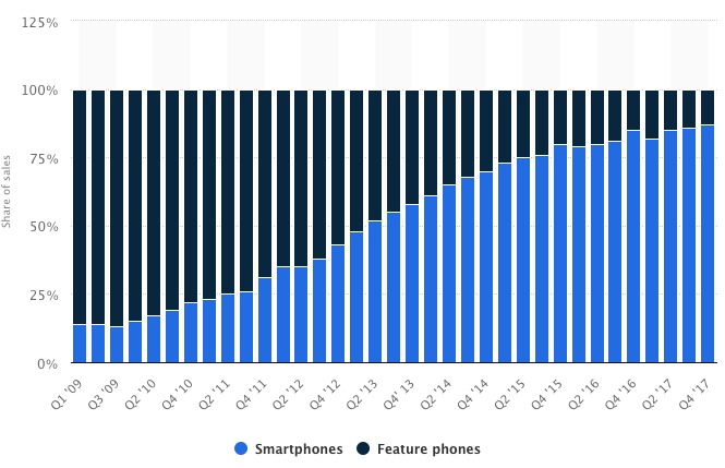(2009-2017 智能手机与功能机市场份额变化,图自:statista)