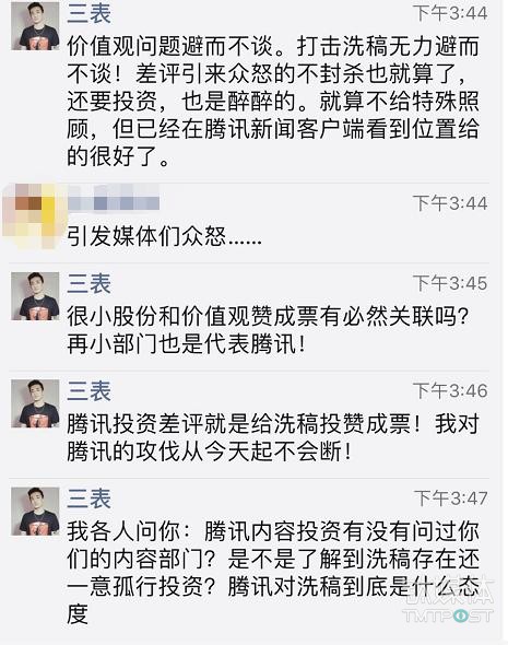 在三表发声后,腾讯公关总监张军进行了回应,称腾讯内容平台会一如既往地支持原创,也会不断加强对洗稿的研究和机制研判。此次投资是业务部门一个topic基金主导的,占很小比例的股份,并非公司级投资;不会在微信平台上获得任何特殊照顾,出现违规,一样会处理。