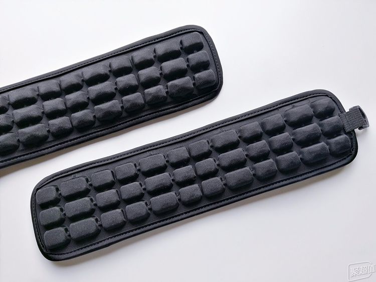 双肩肩带体验不错,减压效果比较明显,戴上之后,肩膀会舒服很多,也比较舒适柔和,没有官方说的按摩的感觉,只是会比较轻松一点。双肩肩带也有个问题,就是稍微宽了一点,在背带较紧的时候,对于肩膀不够宽的人来说,边缘会有些硌得慌。好在肩带提供了两个型号的产品,可以根据自己肩膀宽窄来自由选择。