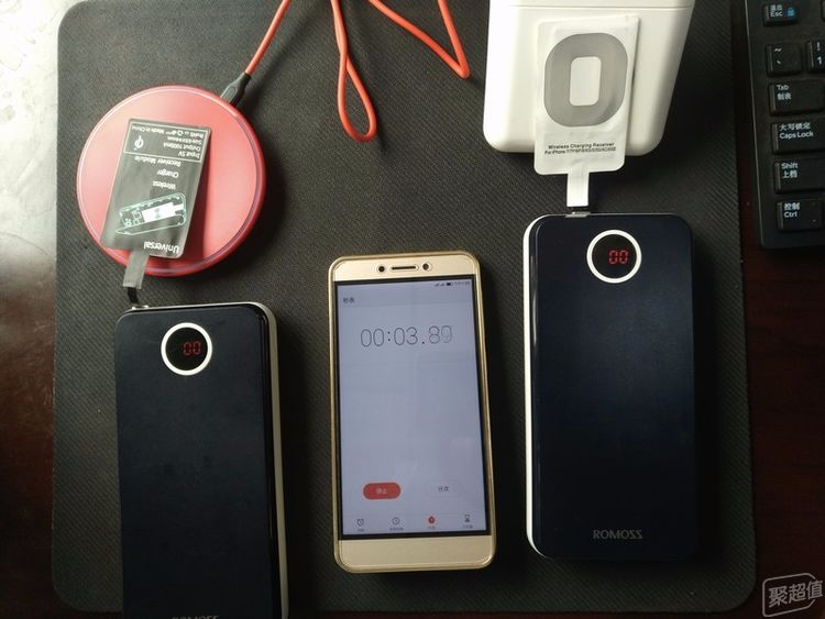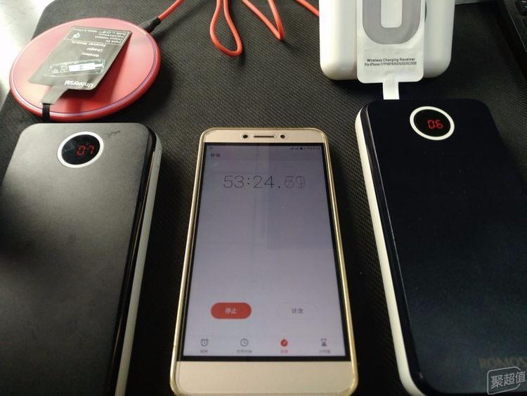 我使用一款桌面的无线充电器配合一共1A的电源适配器,用两个无线充电的背贴连接两块相同型号的带电量指示的移动电源,同时连接X4T电池与桌面无线充电器进行充电对比,经过将近一个小时的时间充电,X4T电池冲入了百分之六的电量,桌面无线充电器冲入了百分之七的电量,X4T电池的无线充电能力几乎与桌面无线充电器相同,可见X4T的无线充电能力还是很不错的。