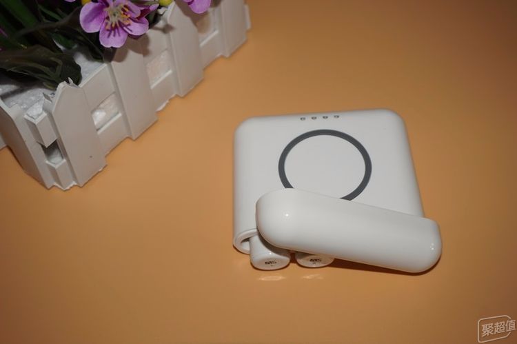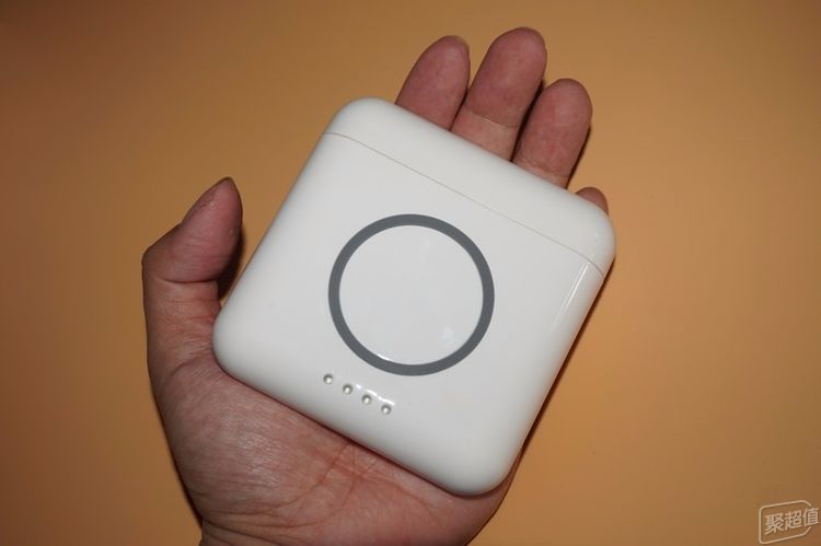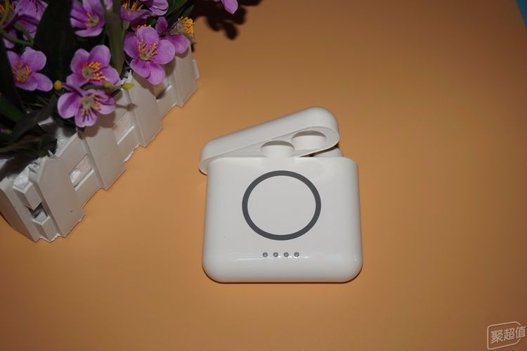 本人这次收到的是白色款的X4T蓝牙耳机,耳机的外部为电源仓盒,表面呈正方形的形状,所有边角均使用圆角处理,手感圆润,仓盒的体积小巧只有手掌大小却内置了5200毫安容量的电源。仓盒正面有一个用灰色圆环圈出的区域我先卖个关子后面会详细的介绍。圆环下面为四颗LED指示灯,可以显示电源的电量和工作状态。仓盒背面与外包装盒使用相同压制的方法展示出产品品名、型号、参数等信息。