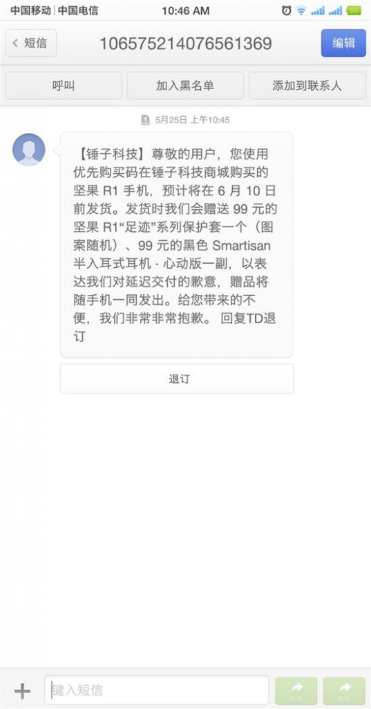 新手机情报 坚果 R1 发货延迟:官方加赠 198 元配件除近日报道的 R1 摄像头刮花,坚果 R1 似乎也遭遇了产能的瓶颈,用户反映,发布会现场发放的优购码购买的坚果 R1 出现了延迟发货的情况。对此,锤子科技向这部分消费者发送了短信,表达了对延迟交付的歉意,同时表示发货时加赠 99 元坚果 R1「足迹」保护套、99 元 Smartisan 半入耳式耳机·心动版两款配件。