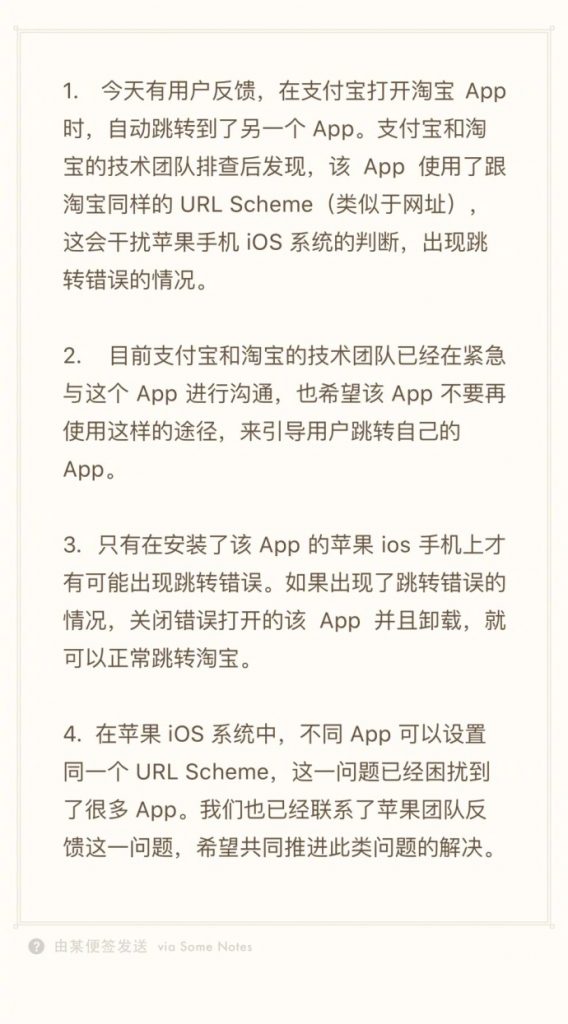 近日,有网友反映,通过《支付宝》打开《淘宝》 会跳转到《易车》,支付宝在微博中发表回应称,经排查发现,《易车》 使用了跟《淘宝》同样的 URL Scheme,这样会干扰苹果手机 iOS 系统的判断,出现跳转错误的情况。目前支付宝和淘宝的技术团队已经在与《易车》沟通,同时联系了苹果团队反馈该问题。