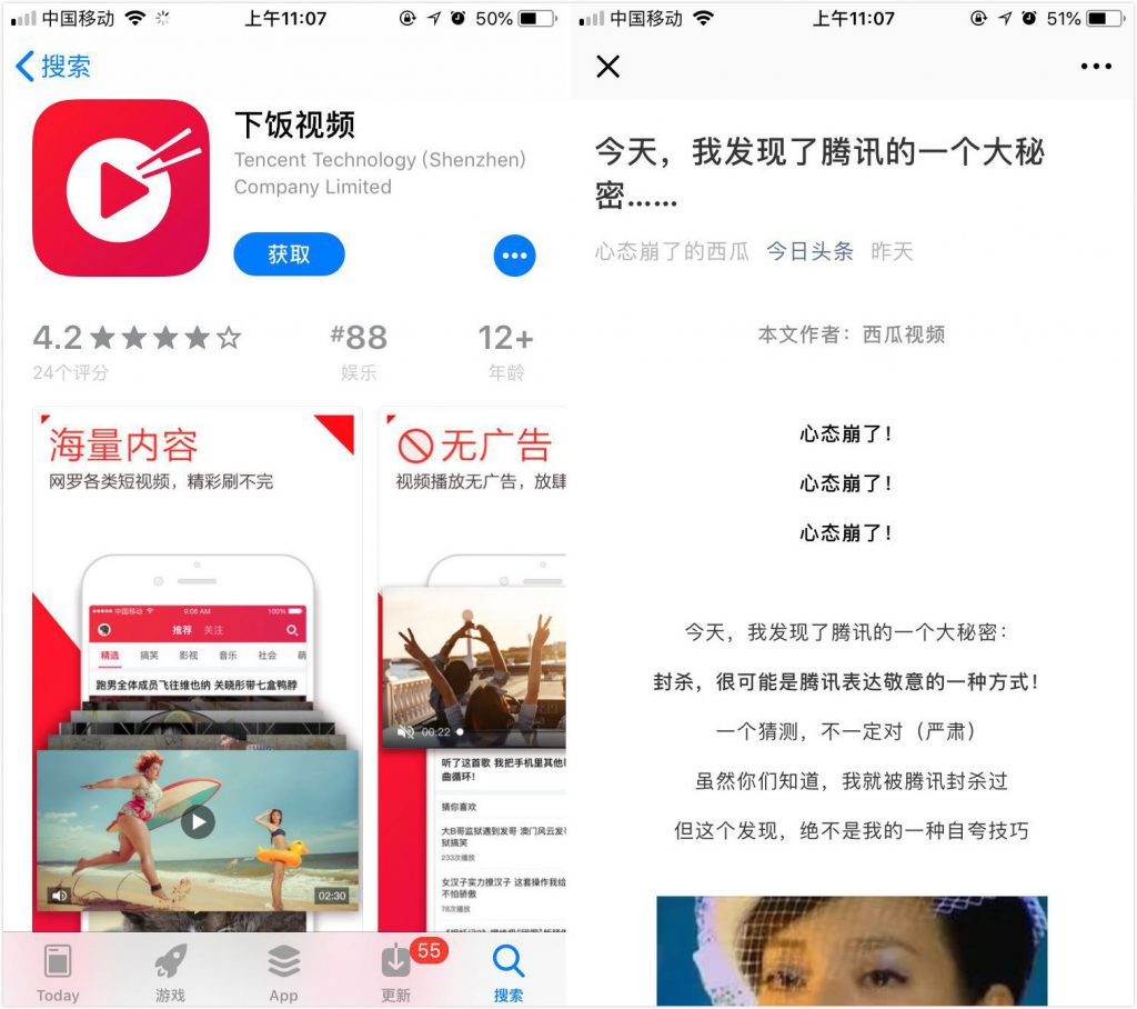 5 月 25 日下午消息,在复活《微视》之后,近日,腾讯再上线了一款短视频产品《下饭视频》。很多用户表示:「以为是今日头条的西瓜视频改版了」。针对腾讯这一举措,西瓜视频发表了一篇名为《今天,我发现了腾讯的一个大秘密……》的文章,称腾讯对短视频平台在微信好友、朋友圈、QQ 空间等链接区别对待。看来,又要上演一场世纪纠纷。