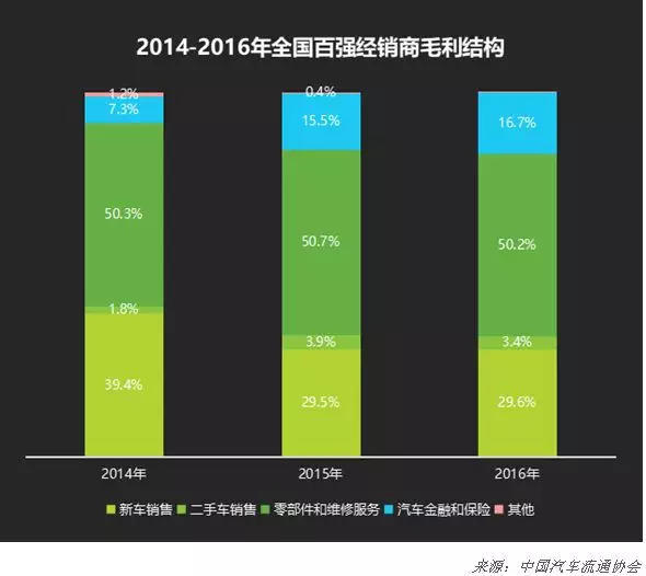 显然,在汽车新零售场景下,金融变现相比易车网时代的广告变现(截至目前最成功的汽车互联网商业模式)更有效率,更有利润厚度,更具规模,打破了汽车电商、传统4S店等汽车零售商卖车不挣钱的汽车零售诅咒(新车零售毛利与车后服务之比为3:7,参见下图)。
