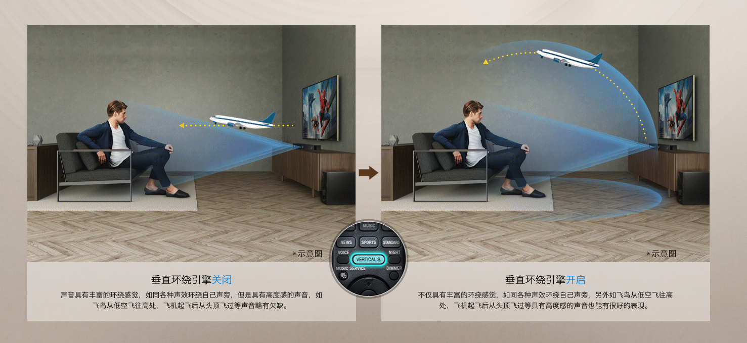 HT-Z9F 和 HT-X9000F 均搭载 S-Force Pro 前置虚拟环绕技术和 VERTICAL SURROUND ENGINE 垂直环绕引擎,这是为了还原声音纵向移动变化效果带来的新技术。遥控中设置了相应的开关,方便用户在需要的时候打开 VERTICAL SURROUND ENGINE。
