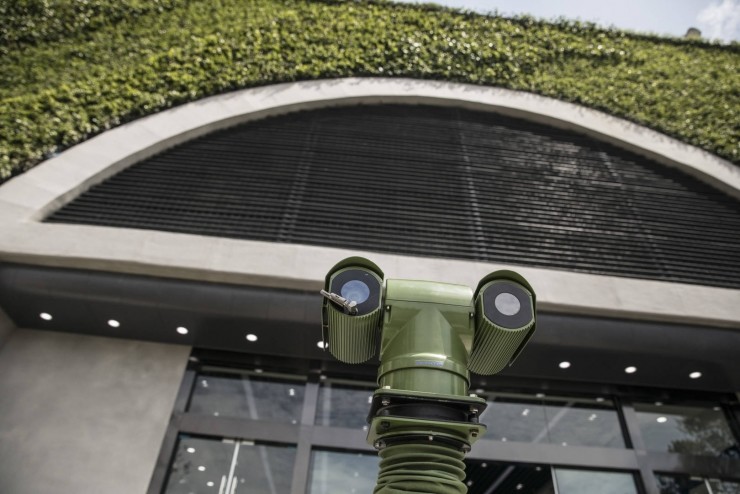 事实上,在安全方面,雷锋网现场探访时也深有所感。下车行至某洞口正门前,就有看到一台军绿色的安保机器人在“呲溜溜”地工作(如下图)。