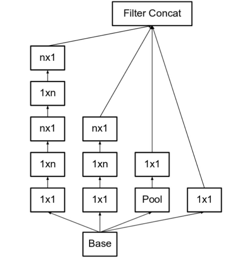 此处如果 n=3,则与上一张图像一致。最左侧的 5x5 卷积可被表示为两个 3x3 卷积,它们又可以被表示为 1x3 和 3x1 卷积。(图源:https://arxiv.org/pdf/1512.00567v3.pdf)
