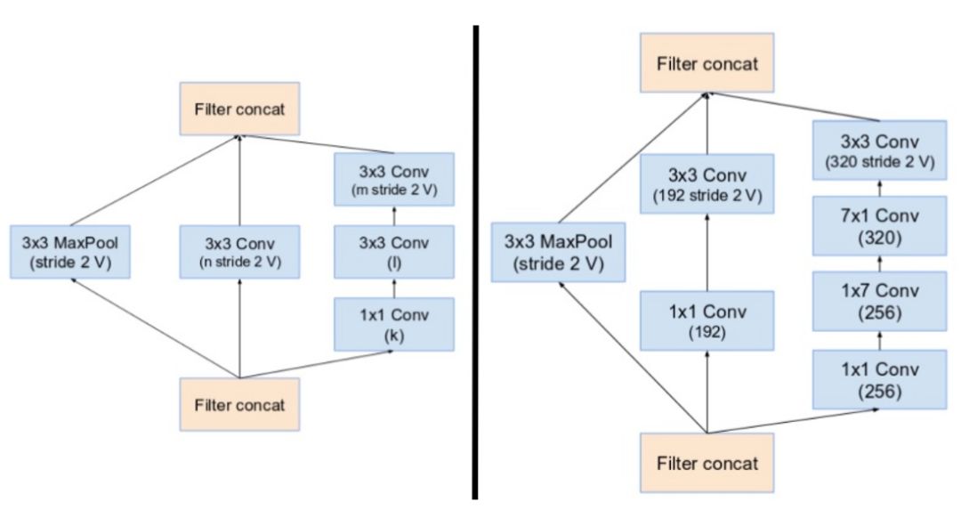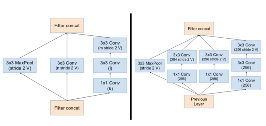 (左起)缩减块 A(从 35x35 到 17x17 的尺寸缩减)和缩减块 B(从 17x17 到 8x8 的尺寸缩减)。这里参考了论文中的相同超参数设置(V,I,K)。(图源:https://arxiv.org/pdf/1602.07261.pdf)