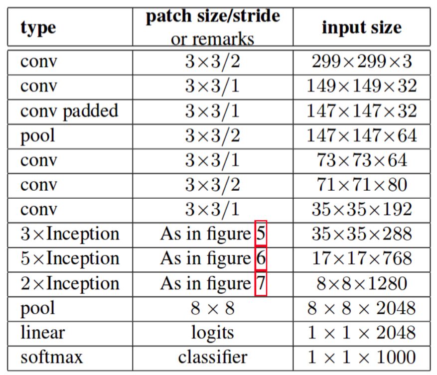 它们有三个主要的 Inception 模块,称为 A、B 和 C(和 Inception v2 不同,这些模块确实被命名为 A、B 和 C)。它们看起来和 Inception v2(或 v3)变体非常相似。