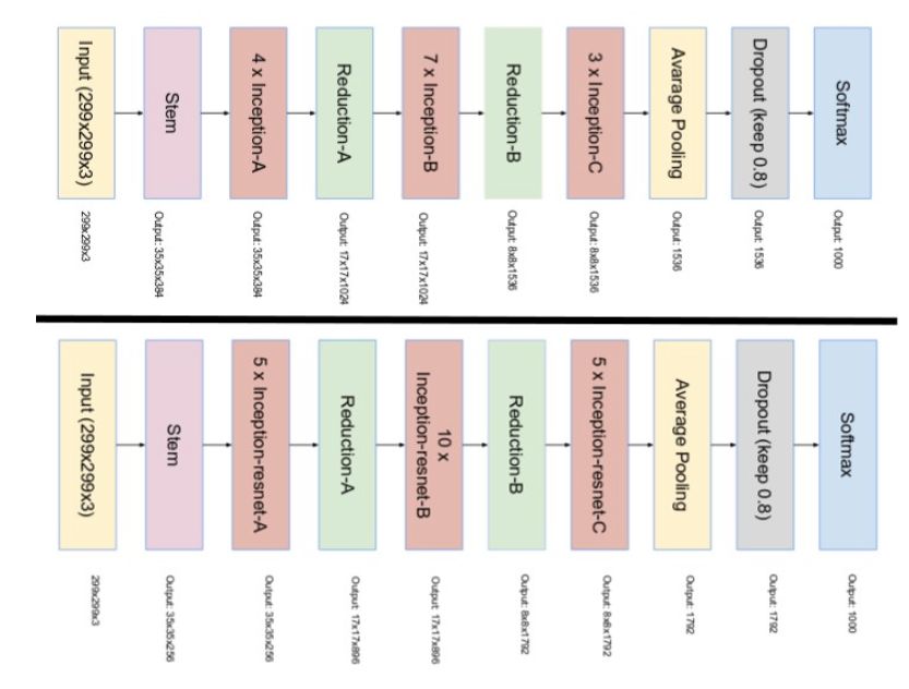 图上部是 Inception v4 的架构。图下部是 Inception-ResNet 的架构。(图源:https://arxiv.org/pdf/1602.07261.pdf)