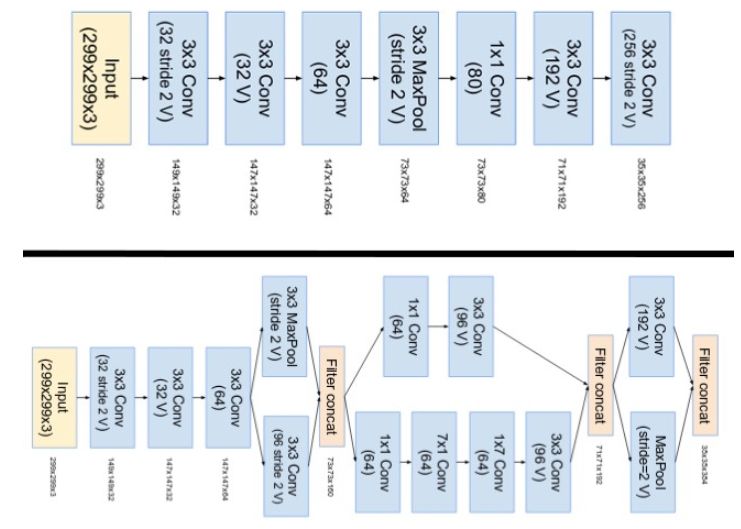 图上部是 Inception-ResNet v1 的 stem。图下部是 Inception v4 和 Inception-ResNet v2 的 stem。(图源:https://arxiv.org/pdf/1602.07261.pdf)