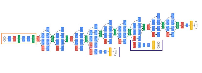 GoogLeNet。橙色框是 stem,包含一些初始卷积。紫色框是辅助分类器。较宽的部分是 inception 模块。(图源:https://arxiv.org/pdf/1409.4842v1.pdf)