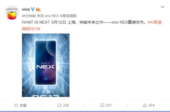 6 月 1 日上午,vivo 官方微博正式宣布,将于 6 月 12 日在上海举办发布会,正式发布真全面屏手机 vivo NEX。但实际上,在早前 vivo X21FIFA 定制版发布会上,有关该手机的消息已经被泄露,vivo NEX 在现在来说根本算不上是秘密。
