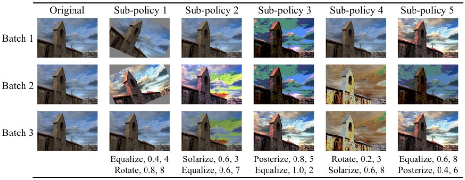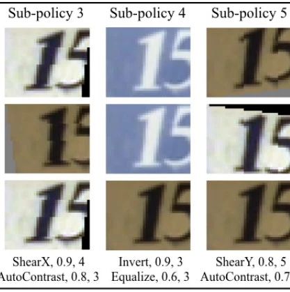 图 1 展示了在搜索空间中的一个包含 5 个子策略的策略示例。第一个子策略指定了依次进行对 X 坐标的剪切(ShearX)和图像翻转操作(Invert)。应用 ShearX 操作的概率是 0.9,并且当应用这个操作时,其幅度为十分之七。接着,作者以 0.8 的概率应用 Invert 操作,该操作不使用幅度信息。作者强调这些操作需要按照指定顺序执行。