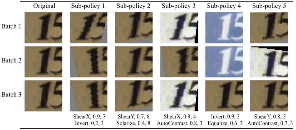 图 1:在 SVHN 上发现的一个策略,以及如何使用它在给定用于训练神经网络的原始图像的条件下来生成增强后的数据。这个策略包含 5 个子策略。对于小批量中的每一张图像,作者均匀地随机选取一个子策略去生成一张变换后的图像来训练神经网络。每个子策略由两个操作组成,每个操作都与两个数值相关联:调用操作的概率、操作的幅度。由于存在调用操作的概率,因此该操作在这个小批量中可能不被应用。然而,如果它被应用了,这个应用的幅度就是固定的。作者通过展示即使使用相同的子策略,一个示例图片能够在不同的小批量中被不同地变换,强调了应用子策略的随机性。正如文中所解释的,在 SVHN 上,AutoAugment 更常采取几何变换措施。我们可以从中看出为什么翻转(Invert)在 SVHN 上是一个被普遍选择的操作,因为图像中的数字在这种变换下具有不变性。