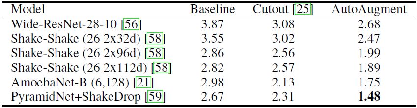表 1:在 CIFAR-10 上的测试集误差率(%)。此误差率越低越好。本文的实验复现了所有基线模型和带 Cutout 的基线模型结果,并且与之前报告的结果 [25,56,58,59] 相匹配。只有 Shake-Shake(26 2x112d)网络例外,该网络比 [58] 中最大的模型拥有更多的滤波器——112 vs 96,而且结果也与之前论文中报告的不同。请注意,在简化的 CIFAR-10 上找到了最好的策略。