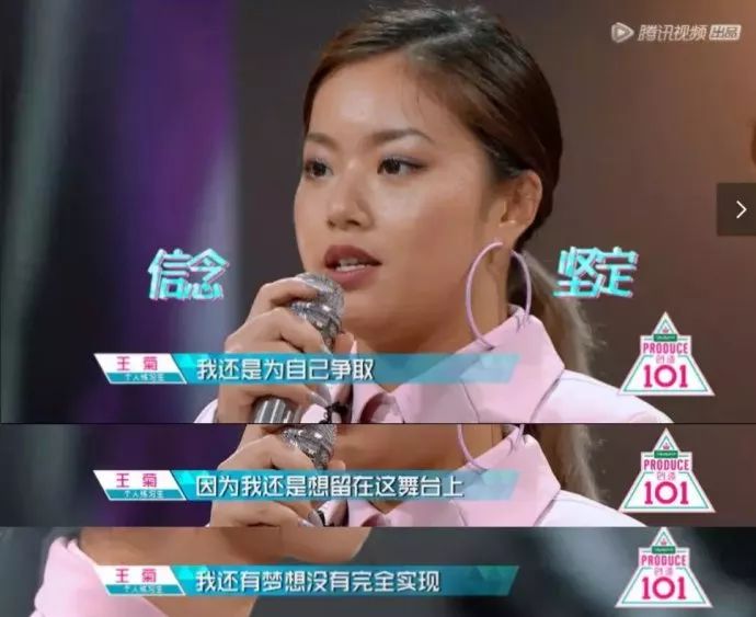 在淘汰赛的时候,小姐姐们把节目哭成了灾祸现场,走了的是真心地放声痛哭,留下来的假惺惺地难过说舍不得,但王菊信念坚定地说“我想留下来,我还有梦想没有完全实现”,这个场景你一定在众多励志催泪的日本动漫里见过,她不哭不笑,她只说自己的心里话——真实得一塌糊涂;