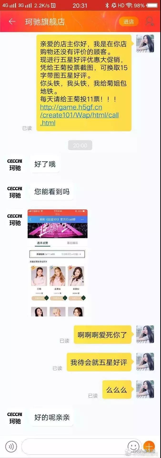 甚至威胁淘宝店家,不给王菊投票,就不给五星好评: