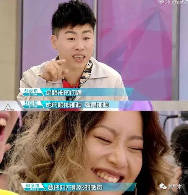 她在舞台上那种舍我其谁、睥睨众生的样子,称之为“迷人”也不为过:那种眼神锁定,连导师胡彦斌都说是“要把对方射死的感觉”。