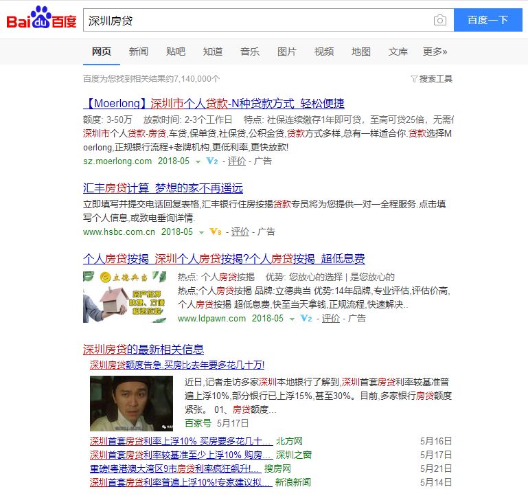 如果直接百度“深圳房贷”,出来的首先还是广告。