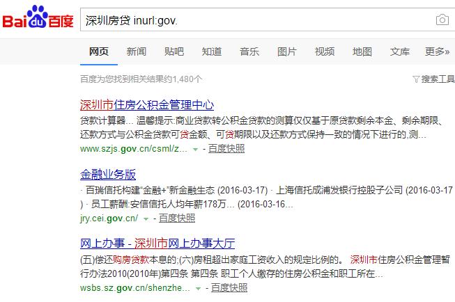 既然要寻找的政府官方信息,而政府的官方网址都包含英文government的缩写字母:gov,那么加上这条限制,搜“深圳房贷 inurl:gov.”,就可以直接筛选出官方信息了,免得被不明中介和贷款公司误导!