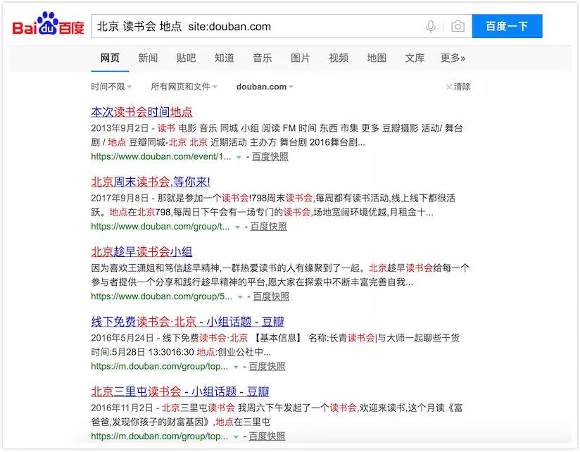 比如我的读书群想办一次线下聚会,但偏偏自己很宅,完全不知道北京哪里有靠谱、便宜的读书会场所,怎么办?自己不会做的题,可以搜别人的答案抄作业呀,北京文艺青年这么多,不可能只有我们这一个群办读书会。直接瞄准文艺青年大本营豆瓣就行,输入关键词“北京 读书会 地点”和限定只搜豆瓣这一个网站的指令“site:douban.com”就行。