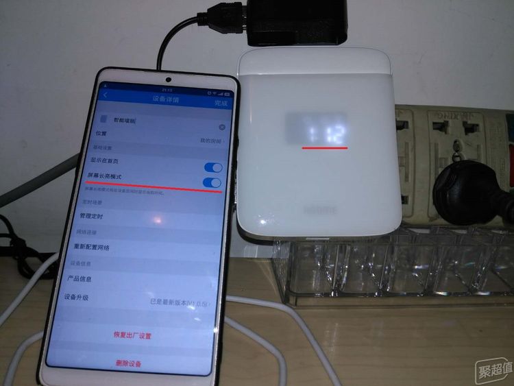 还有一点是想在显示屏上显示时间,找了半天也没找到在哪进行屏幕显示设置,最后问了厂家的客服才知道是在“设备详情”中启动“屏幕长亮模式”,可以在墙插精灵上显示当前时间。