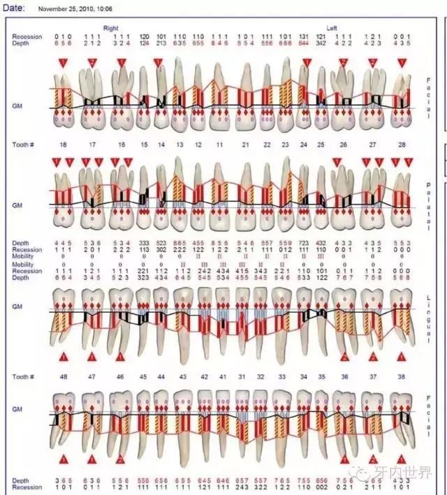洗完牙一周后牙龈的肿胀一般消退了。通过手工牙周探针或 Florida 牙周电子探针探测。检查并记录每颗牙齿的唇(颊)侧近中、中央、远中、及舌侧近中、中央、远中 6 个位点不同探针深度。再用尖探针探察龈下牙石,明确其大小位置。