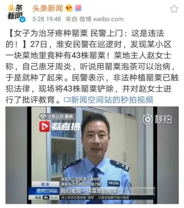 近日看到一则新闻,淮安民警在巡逻时,发现一块菜地有人种了 43 株罂粟,要知道这可是国家明令禁止种植的植物。据菜地的主人说是为了用罂粟泡茶治疗自己的牙周炎。