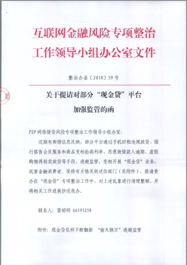 该函件称,近期舆情信息反映,部分平台通过手机回租违规放贷,强行搭售会员服务和商品变相提高利率,恶意致借款人逾期,虚假购物再转卖放贷等手段,逃避监管,变相开展“现金贷”业务,坑害金融消费者。因此,互金整治办提请P2P网络借贷风险专项整治工作领导小组办公室,在“现金贷”专项整治过程中,对上述乱象进行清理整顿,并将相关工作进展抄送互金整治办。