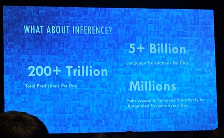 用一定的数据训练一个模型需要多少计算量、多少时间大家基本都心里有数,那么推理阶段的计算量需求如何呢?实际上 Facebook 的机器学习模型每天要做超过两千亿次推理,其中包括五十亿次语言翻译,以及数百万次的由自动检测系统主动地删除假冒账户。