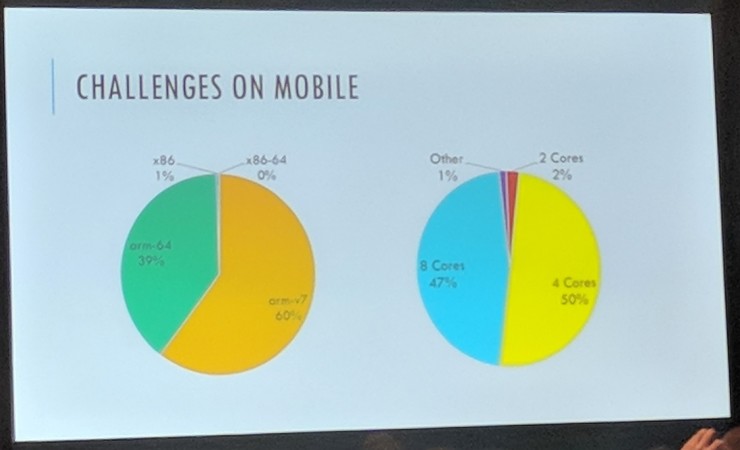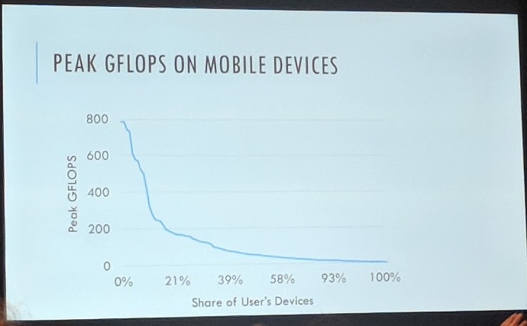 目前全世界已经有超过 10 亿部手机上运行着神经网络应用。在移动设备上本地运行的机器学习算法在隐私性、本地响应性和用户体验上都有更好的表现,但移动设备的一大挑战就是计算能力非常有限,使用 ARM 处理器的设备中 60% 还是基于老旧的 32 位 arm-v7 指令集,同时超过半数的设备只有不多于 4 个核心。这样的结果就是,峰值计算性能高于 200 GFlops 的设备只有不到 20%,高于 600 GFlops 的简直凤毛麟角。