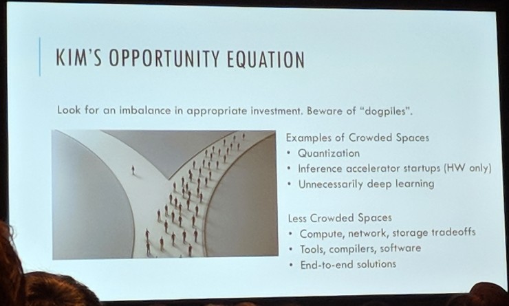 所以 Kim 也提出了自己的「机会方程」:正确的投入方式需要有一些不平衡;要小心别人一窝蜂挤进去的领域。已经拥入很多研究者的领域包括量化、做硬件的推理加速器初创公司、不必要的深度学习方法。而计算、网络与存储之间的平衡,工具、编译器、软件,端到端解决方案等课题就是不那么火热的、更适合的投入方向。