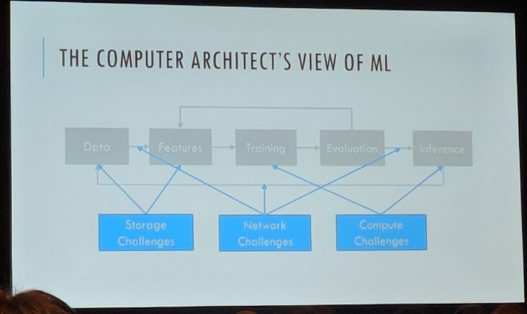 在研究机器学习理论本身的人看来,工作流程分为「数据-特征-训练-评价-推理」五部分是自然而然的事情。而根据机器学习算法应用时的系统需求来看,计算机架构研究人员眼中的机器学习对数据的存储、网络连接、计算能力都提出了新的挑战。