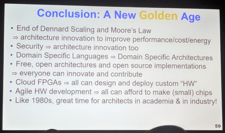John Hennessy 与 David Patterson 两人相信,标准的微处理越来越难以提升的性能、高级别领域专用的语言与安全性方面的机会、专有 ISA 链上的架构设计师的解放、以及 Dennard 缩放定律和摩尔定律的失效将共同带来一个计算架构的新的黄金时代。开源生态系统、芯片原型的敏捷开发都会带来实实在在的进步,从而加速商业应用。两人期待新的黄金时代的技术进步会像上一个时代一样地快,只不过如今的关注点是在于成本、能耗、安全,同时兼顾性能。