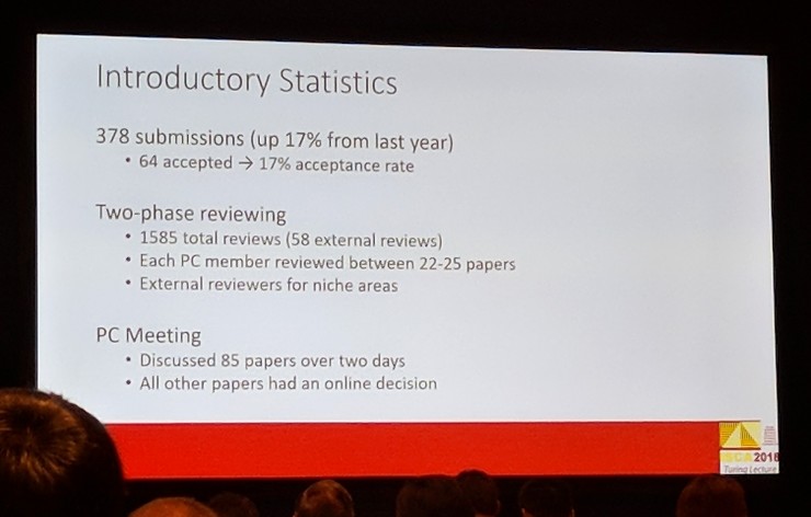 ISCA 2018 的论文投稿为 378 篇,比去年增加了 17%;接收论文数目为 64 篇,接收率为 17%。接收结果出自程序委员会对论文进行的两个阶段的详细评审。投稿论文中数量最多的研究课题为加速及领域专用架构,前十热门的课题还有内存系统、多核和并行架构、微架构、低功耗架构与技术、新兴内存技术、层级化缓存、新兴计算架构、云与数据中心规模的计算、计算机系统的评价。