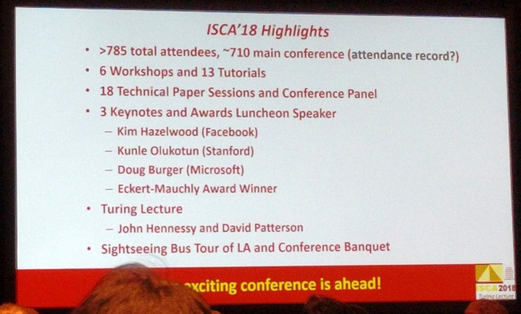 第一天早上的开幕演讲中组委会首先介绍了会议概况。如前文所说,今年 ISCA 共有超过 785 名参会者,大约 710 名参与了会议正会。这一数字有可能会创下 ISCA 这 45 年来的新的历史纪录。会议设置了 18 个论文报告 session,主题包括云和数据中心、新兴 app 的加速、预读取(prefetching)、语言和模型、虚拟内存、相关性与存储排序、新兴范式、持续性(persistence)、新兴内存、存储器、控制器和控制系统、移动平台、安全、互联网络、GPU,以及近年来火热的机器学习系统。