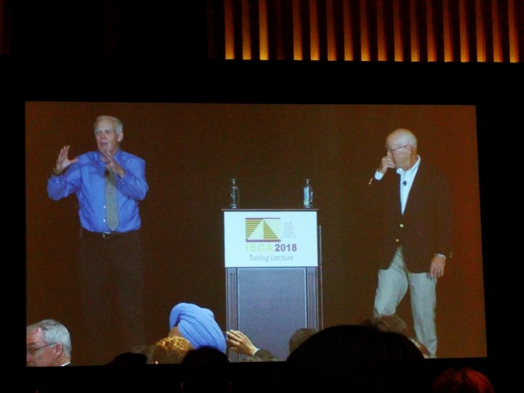 除了例行的大会报告、圆桌讨论、论文 session、workshop、tutorial、洛杉矶市内观光大巴游览之外,会议还有一大亮点是邀请了今年 3 月刚刚颁布的图灵奖获得者 John L. Hennessy 和 David A. Patterson 到场演讲。实际上,二人获得有「计算机领域的诺贝尔奖」之称的图灵奖,正是因为二人「开创了一种系统的、定量的方法来设计和评价计算机体系结构,并对 RISC 微处理器行业产生了持久的影响」(ACM 颁奖词),这正是 ISCA 会议关注的核心课题之一。获奖后在 ISCA 进行主题演讲,二人想必也收到了最热烈的掌声和最高的敬意。